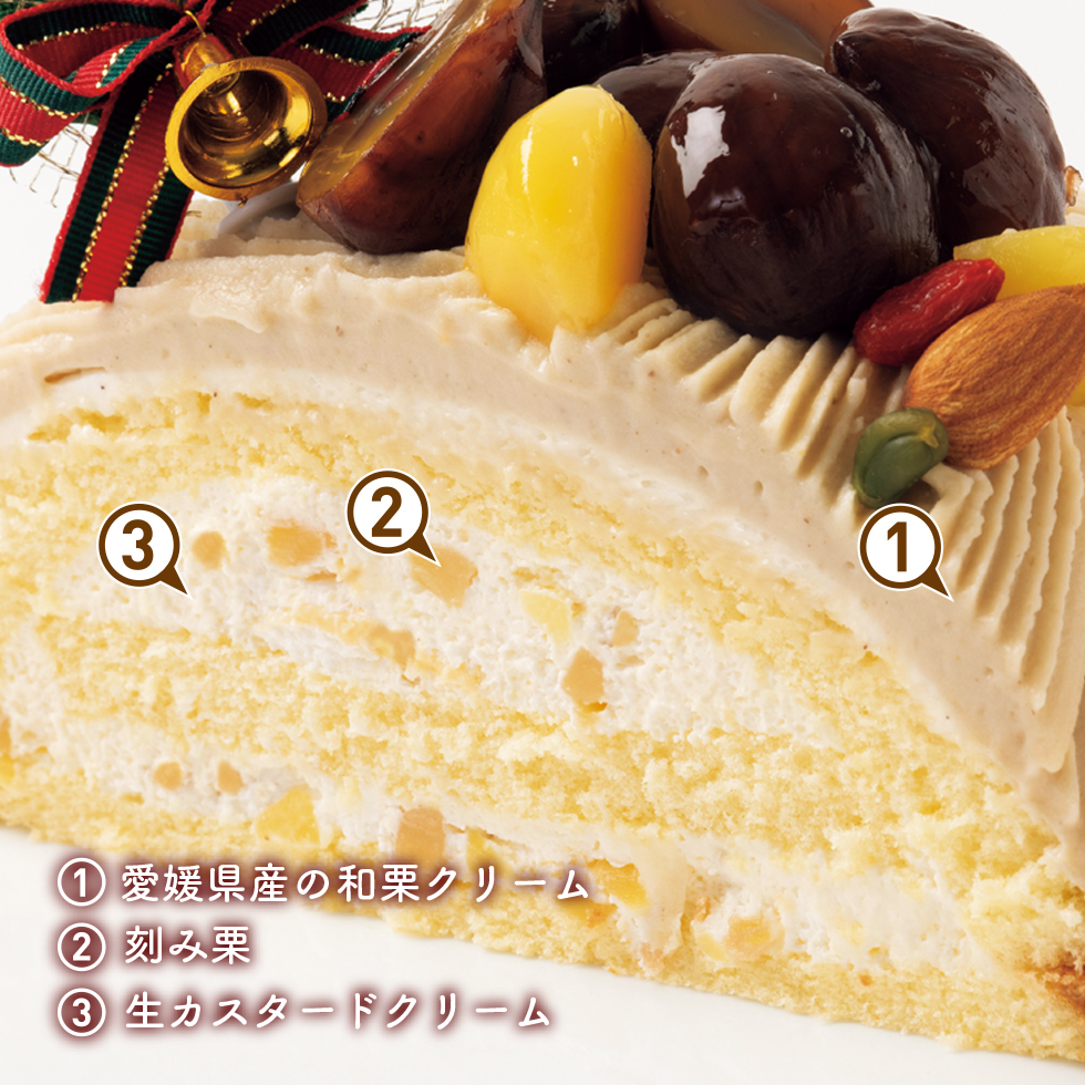 - 刻み栗を忍ばせてまろやかな愛媛県産の和栗クリームをたっぷりと絞りました。栗特有の上品でやさしい甘さとほっこりとした風味はモンブラン好きにこそ食べてほしい特別な味わい。