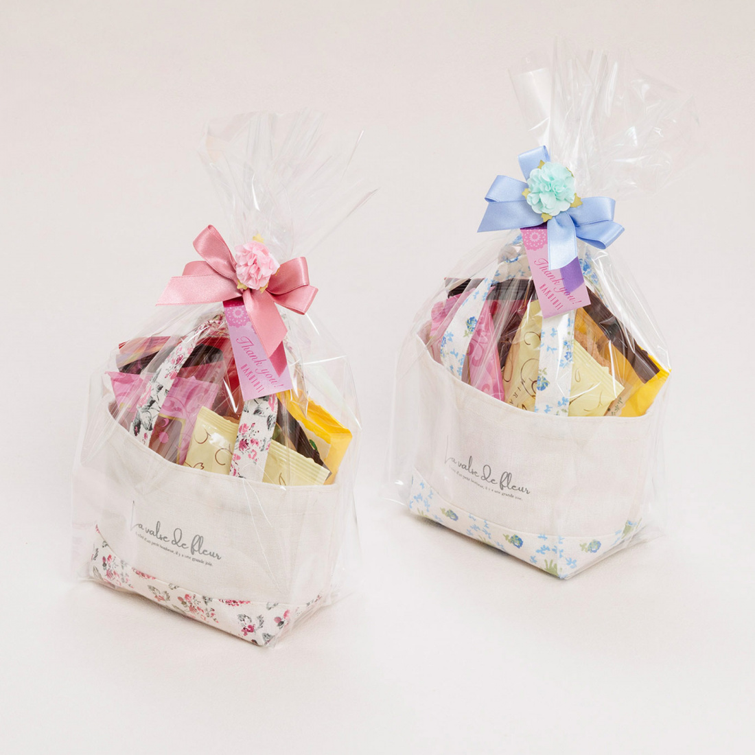 花柄のミニトートに焼菓子を詰め合わせた「フラワーバスケット」、「フィオーレ」は、化粧ポーチや小物入れなどにアフターユースできます。